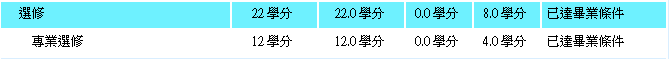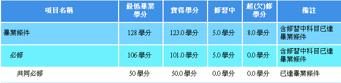 共同科目、專業必修、專業(系訂)選修學分未達系科規定。 |