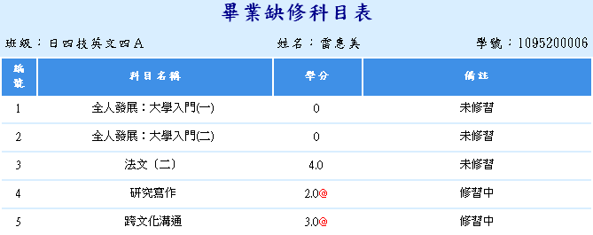 - 若有缺修或尚未修習及格之學分,請利用最後一學期重(補)修。