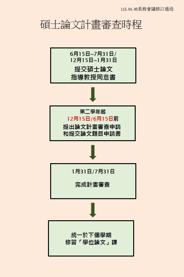依照115.04.08 系務會議修正通過,114-2學期生效,適用於所有還未畢業之研究生。碩士論文計畫審查時程修正日期如下圖所示,相關更新細節及流程請見附檔,如有任何疑問請至系辦詢問昕怡系助。